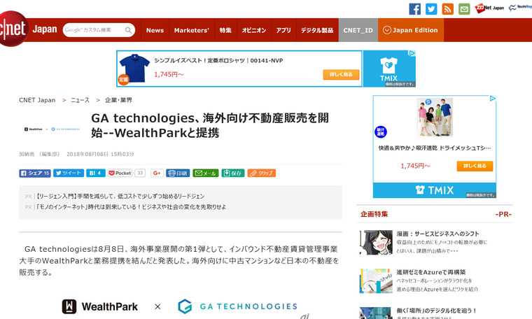 『GA technologies、海外向け不動産販売を開始--WealthParkと提携』
