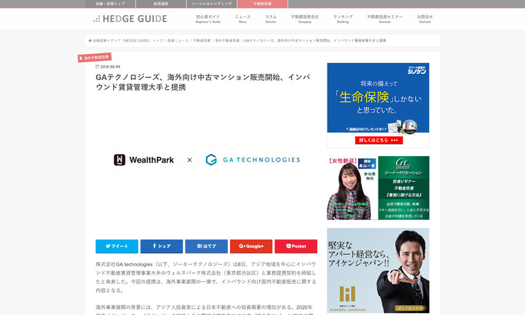 HEDGE GUIDE|『GAテクノロジーズ、海外向け中古マンション販売開始、インバウンド賃貸管理大手と提携』