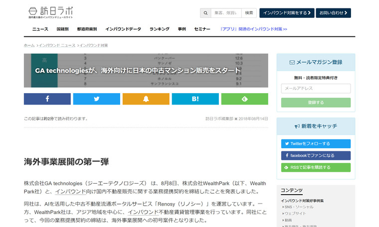 訪日ラボにて、インバウンド不動産賃貸管理事業大手のWealthParkと当社の業務提携を掲載していただきました。