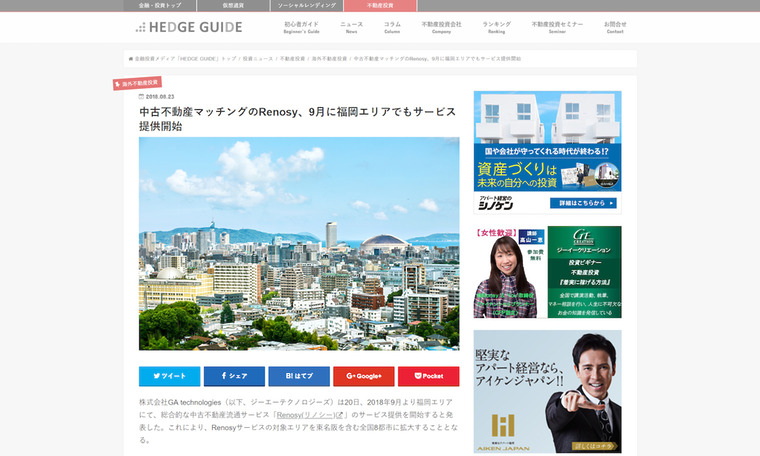 HEDGE GUIDEにて、Renosyの福岡エリアへのサービス提供開始を掲載していただきました。
