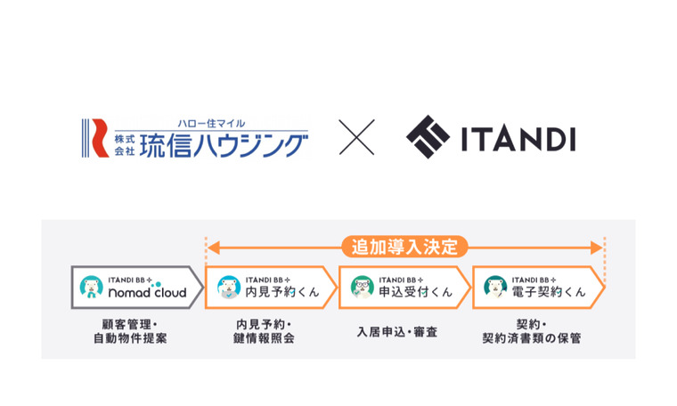 当社のグループ会社であるイタンジ株式会社は、 管理戸数8,000戸超であり、沖縄県で創業35年の歴史を持つ琉信ハウジング全支店に、イタンジが提供する内見予約WEB受付システム「内見予約くん」、入居申込サービス利用数 No.1(※2)の不動産関連WEB申込受付システム「申込受付くん」、不動産関連電子契約システム「電子契約くん」を導入いたします。沖縄発の企業で、客付けから内見・入居申込・賃貸借契約までを完全電子化するのは初となります。(※1)