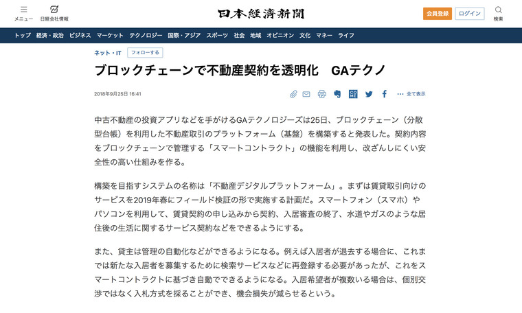 【掲載情報】日本経済新聞電子版(2018.09.25)「ブロックチェーンで不動産契約を透明化 GAテクノ」