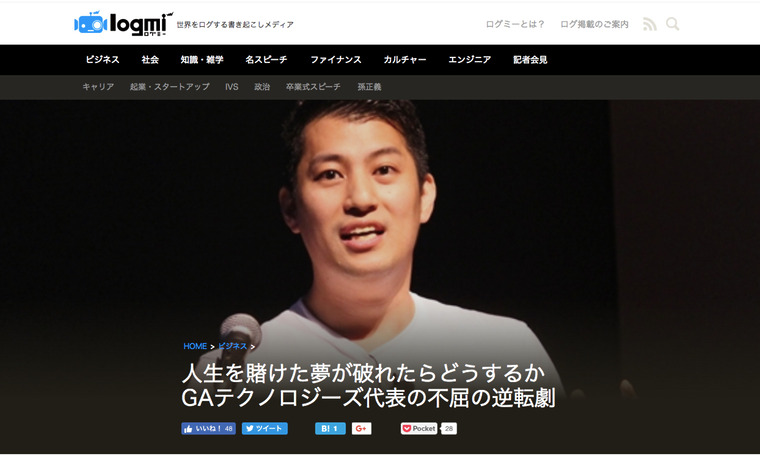 【掲載情報】logmi(2018.09.28)人生を賭けた夢が破れたらどうするか GAテクノロジーズ代表の不屈の逆転劇