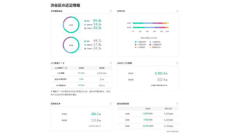 世帯種類構成、世帯年収、人口総数や人口増加率などの人口関連データ、企業数、犯罪発生率、近隣の販売価格相場など、これまでの物件情報や物件ごとの推定価格などに加え、エリアとしての住宅価値も分かりやすくなりました。