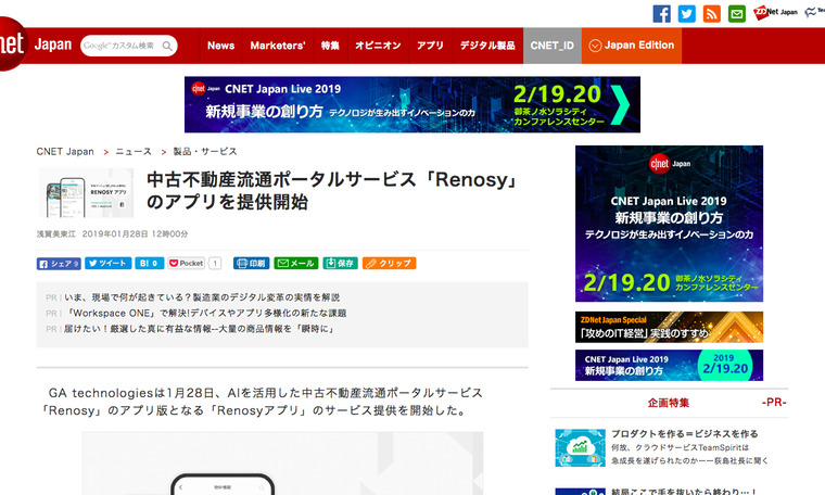 CNET Japanにて、RENOSYアプリの提供開始を掲載していただきました。
