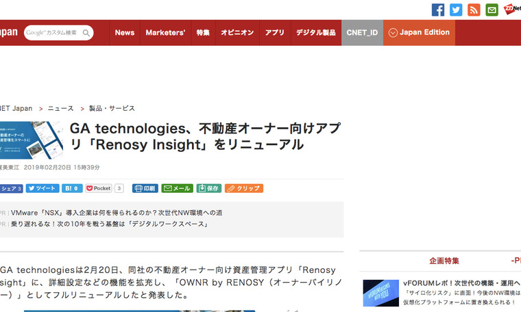 【掲載情報】CNET Japan(2019.02.20)『不動産オーナー向けアプリ「Renosy Insight」をリニューアル』