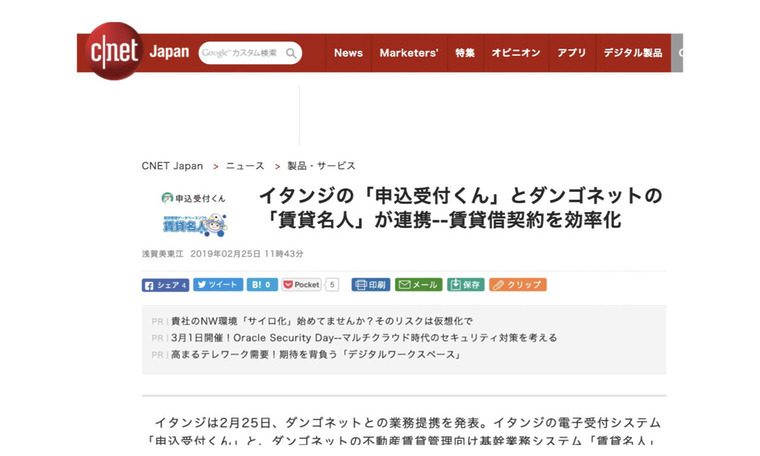 【掲載情報】CNET Japan(2019.02.25)『イタンジの「申込受付くん」とダンゴネットの「賃貸名人」が連携』 「申込受付くん」と「賃貸名人」の連携についてご紹介いただきました。