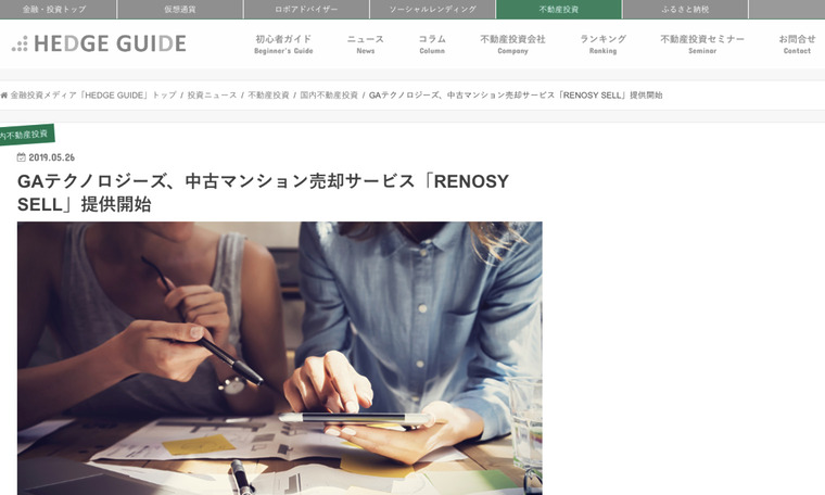 金融投資メディアHEDGE GUIDEにて、中古マンション売却サービス「RENOSY SELL」をご紹介いただきました。