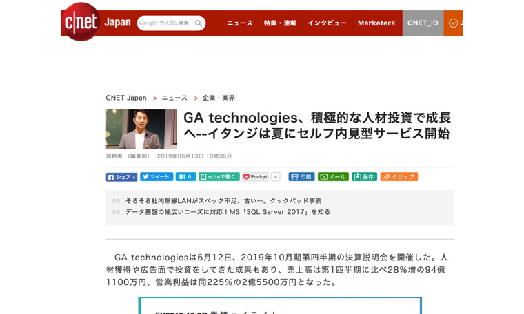 6月12日に開催した2019年10月期第2四半期決算説明会についてご掲載いただきました。