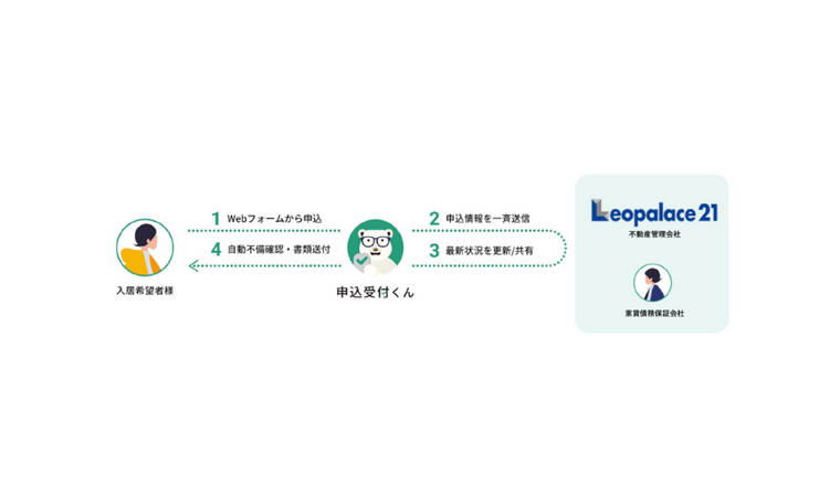 イタンジが提供する「申込受付くん」は、賃貸物件の入居申し込みに関わる煩雑な手続きのデジタル化により、入居希望者が希望の物件に入居するまでの時間と手間を大幅に削減できるWEB申し込み受付システムです。レオパレス21への導入にあたり、レオパレス21の運営する賃貸物件掲載サイトと申込受付くんをシステム連携し、入居希望者による物件掲載サイトからの直接申し込みを可能にしました。