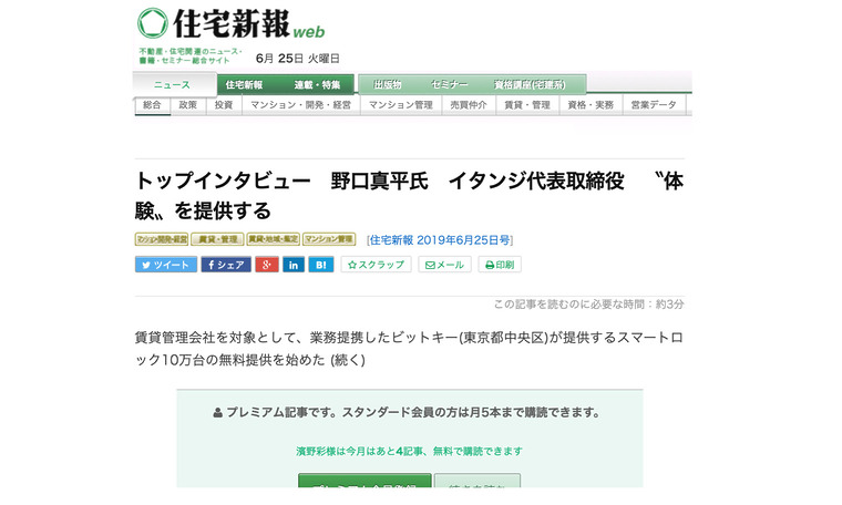 【掲載情報】住宅新報(2019.06.25)『トップインタビュー 野口真平氏 イタンジ代表取締役 〝体験〟を提供する』