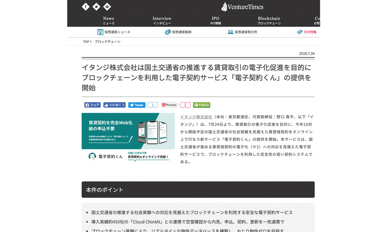 『イタンジ株式会社は国土交通省の推進する賃貸取引の電子化促進を目的に ブロックチェーンを利用した電子契約サービス「電子契約くん」の提供を開始』