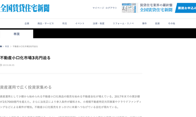 全国賃貸住宅新聞|『不動産小口化市場3兆円迫る』