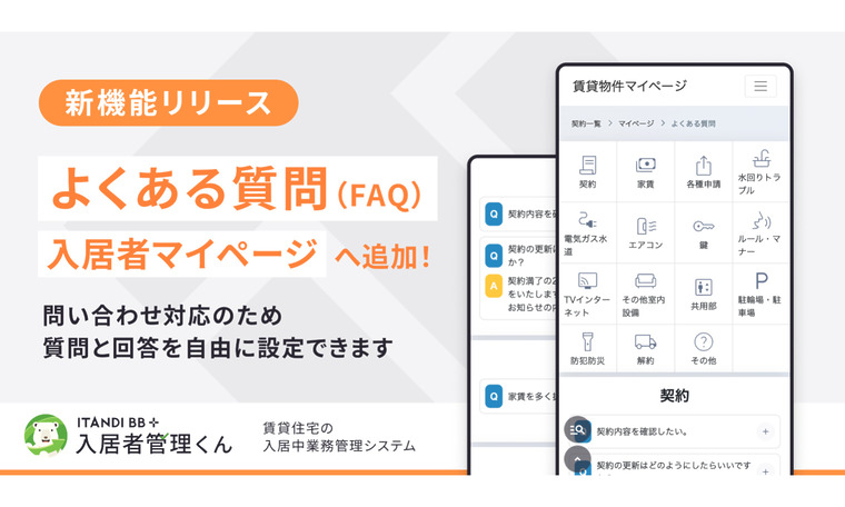 こうした課題を解決するため、この度「入居者管理くん」に「よくある質問(FAQ)機能」を追加しました。管理会社は、会社ごとによくある質問とそれに対する回答を登録することができ、入居者はマイページ上で24時間いつでも簡単に情報を確認し、タイムリーに自己解決することが可能になります。質問と回答は、「契約」「水回りトラブル」などカテゴリごとに整理され、入居者はカテゴリを選択したり、キーワード検索機能を活用することで、スムーズに情報を探すことができます。