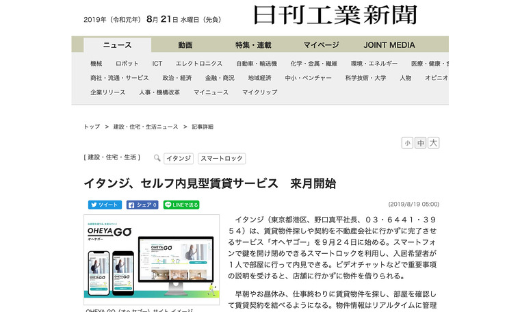日刊工業新聞にて、イタンジのセルフ内見型 賃貸サービス「OHEYA GO」についてご紹介いただきました。