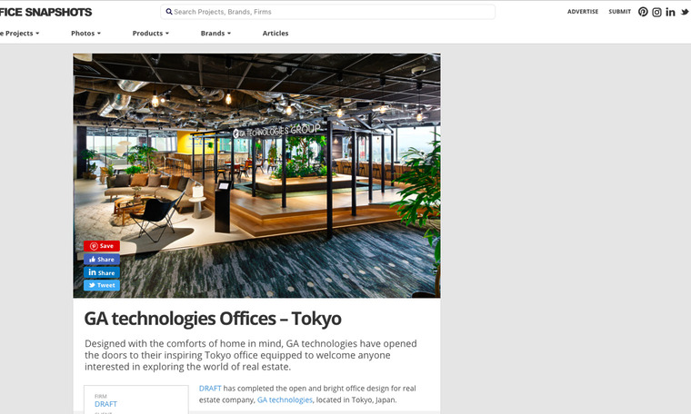 カリフォルニアに拠点を置く、世界最大級のオフィスデザインプラットフォームOFFICE SNAPSHOTSにて、当社のオフィスをご紹介いただきました。