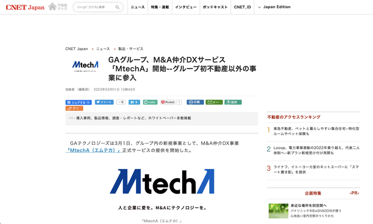 CNET Japanにて、当社グループの新規事業であるM&A仲介DXサービス「MtechA」をご紹介いただきました。