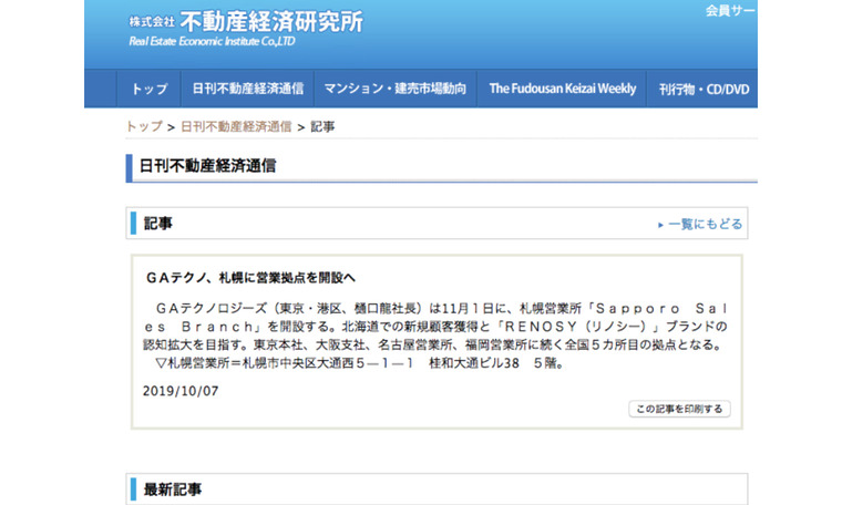 不動産経済研究所|『GAテクノ、札幌に営業拠点を開設へ』