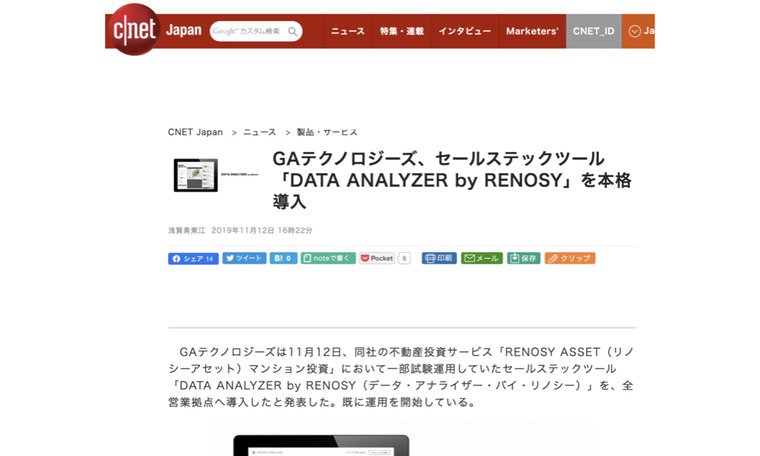CNET Japanにて、当社のセールステックツール「DATA ANALYZER by RENOSY」をご紹介いただきました。