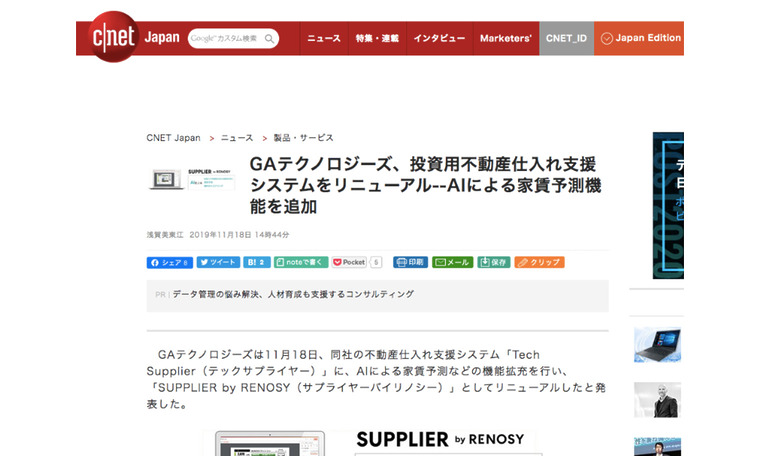 CNET Japanにて、当社の不動産仕入れ支援システム「Tech Supplier(テックサプライヤー)」をご紹介いただきました。
