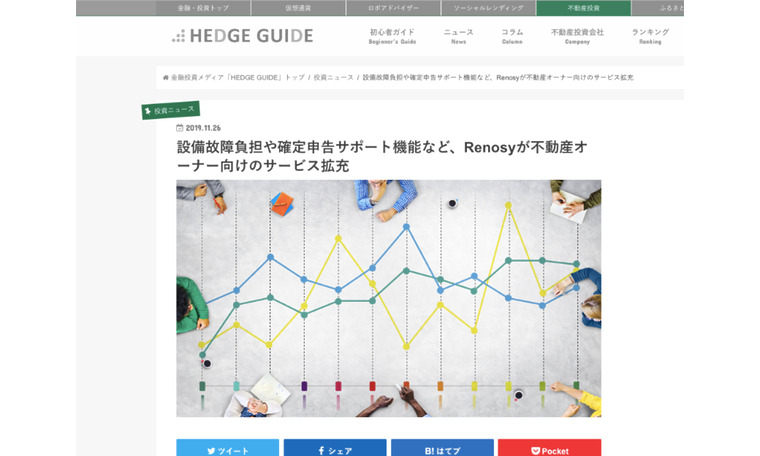 HEDGE GUIDEにて、不動産オーナー向けに設備故障に対する費用負担を含むサブスク型の賃貸管理サービス「RENOSY ワイドプラン」をご紹介いただきました。また、不動産オーナー向けアプリ「OWNR by RENOSY(オーナー バイ リノシー)」の確定申告サポート機能の追加も掲載していただきました。