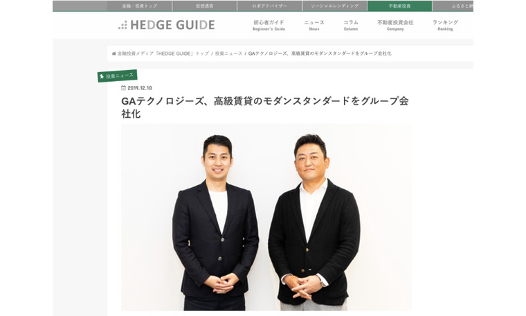 【掲載情報】HEDGE GUIDE(2019.12.10)『GAテクノロジーズ、高級賃貸のモダンスタンダードをグループ会社化』HEDGE GUIDEにて、モダンスタンダード社のグループ会社化をご紹介いただきました。