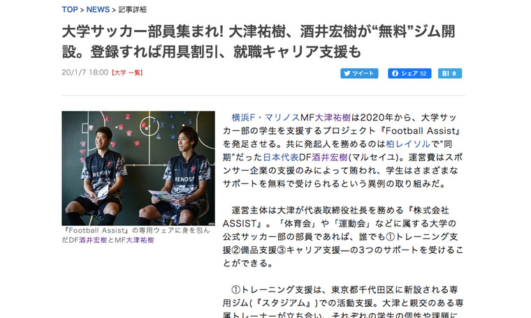 『大学サッカー部員集まれ! 大津祐樹、酒井宏樹が“無料”ジム開設。登録すれば用具割引、就職キャリア支援も』
