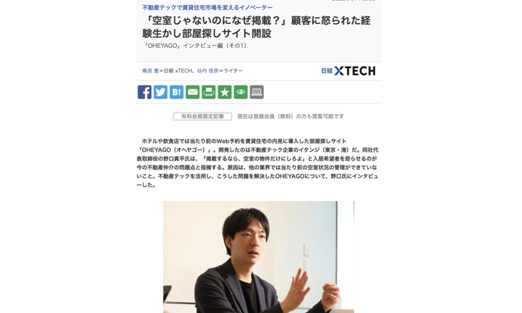日経 xTECHの連載企画「不動産テックで賃貸住宅市場を変えるイノベーター」にて、当社の子会社であるイタンジ代表の野口が、セルフ内見型賃貸サイト「OHEYAGO」の開設背景などについてインタビューを受けました。