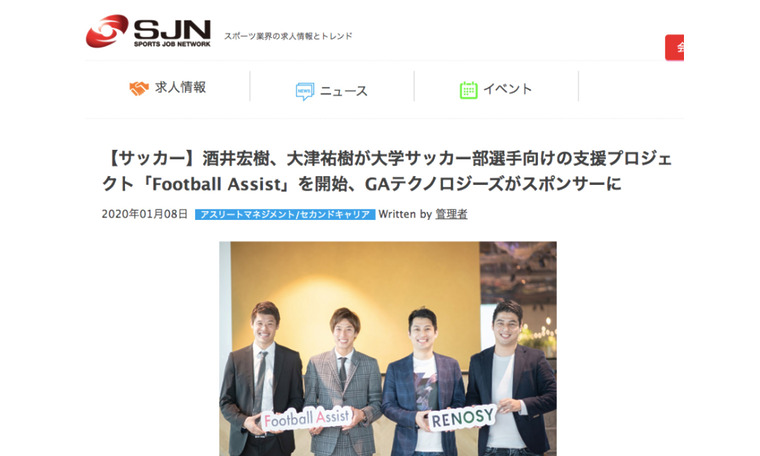 SPORTS JOB NETWORKにて、当社が、2020年1月7日より、株式会社Assistが開始する「Football Assist(フットボールアシスト)」プロジェクトのスポンサーに就任したことをご紹介していただきました。「Football Assist」は、現役プロサッカー選手として活躍する酒井宏樹選手と大津祐樹選手が発起人となり立ち上げた、大学サッカー部の活動を、現在の部活動から将来のキャリア選択まで、長期的に支援するプロジェクトです。