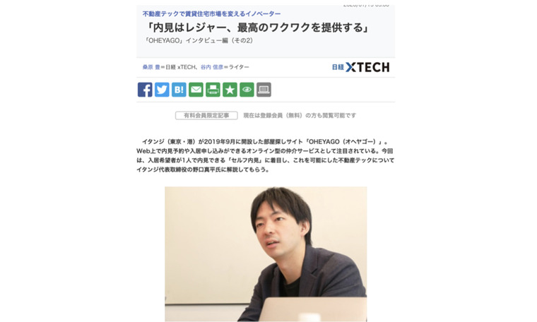 日経 xTECHの連載企画「不動産テックで賃貸住宅市場を変えるイノベーター」にて、当社の子会社であるイタンジ代表の野口が、入居希望者が1人で内見できる「セルフ内見」に着目した理由と、これを可能にした不動産テックについてお話させていただきました。