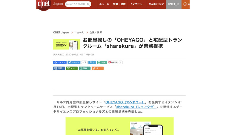 Cnet Japanにて、当社の子会社であるイタンジが提供するセルフ内見型賃貸サービス「OHEYAGO」と宅配型トランクルーム「sharekura」の提携についてご紹介いただきました。