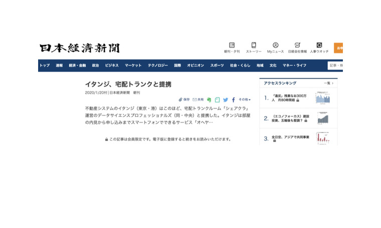 日本経済新聞の朝刊および電子版にて、当社の子会社であるイタンジ株式会社 が提供するセルフ内見型お部屋探しサイト「OHEYAGO(オヘヤゴー)」(https://oheyago.jp/)と、データサイエンスプロフェッショナルズ株式会社が提供する宅配型トランクルームサービス「sharekura(シェアクラ)」(https://sharekura.com/)の提携について取り上げていただきました。