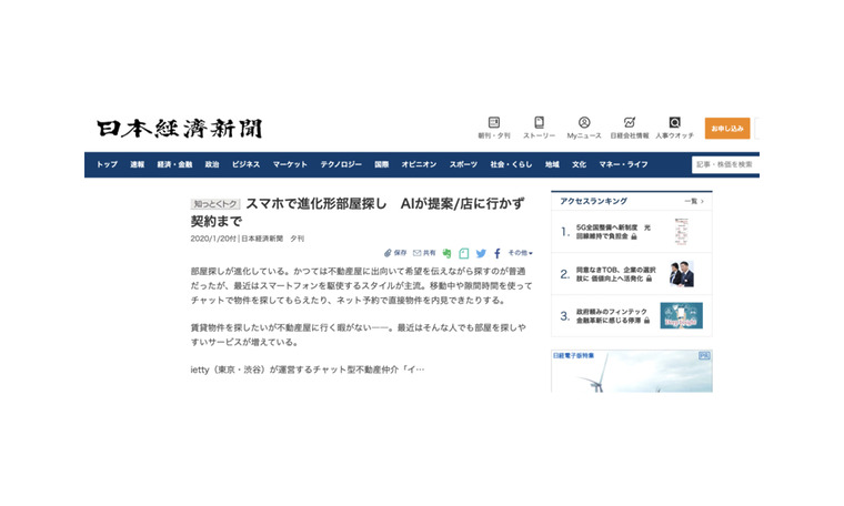 日本経済新聞|『スマホで進化形部屋探し AIが提案/店に行かず契約まで』