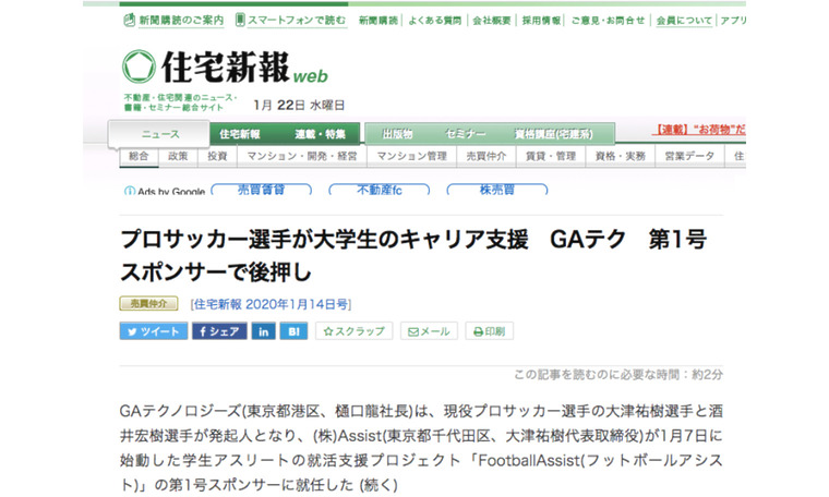 住宅新報にて、当社の提供するRENOSYがスポンサーを務める「Football Assist」をご紹介いただきました。「Football Assist」は、現役プロサッカー選手として活躍する酒井宏樹選手と大津祐樹選手が発起人となり立ち上げた、大学サッカー部の活動を、現在の部活動から将来のキャリア選択まで、長期的に支援するプロジェクトです。
