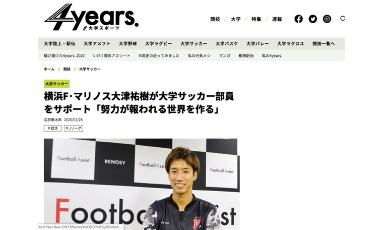 4years.にて、当社の提供するRENOSYがスポンサーを務める「Football Assist」をご紹介いただきました。「Football Assist」は、現役プロサッカー選手として活躍する酒井宏樹選手と大津祐樹選手が発起人となり立ち上げた、大学サッカー部の活動を、現在の部活動から将来のキャリア選択まで、長期的に支援するプロジェクトです。