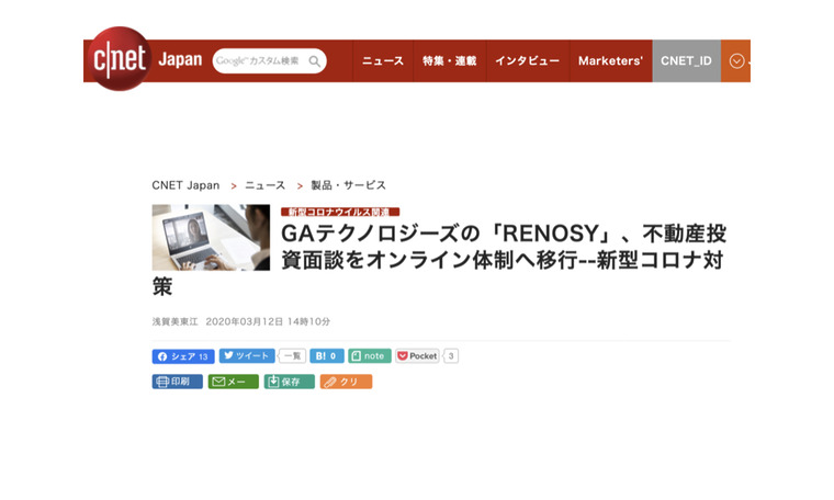 Cnet Japan|『「RENOSY」、不動産投資面談をオンライン体制へ移行--新型コロナ対策』
