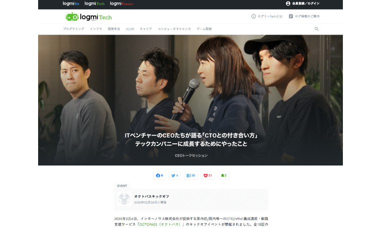 logmi Techにて、代表の樋口が登壇したイベントのレポートが公開されました。本イベントは、インターノウス株式会社が提供する国内初/国内唯一のCTO/VPoE養成講座・転職支援サービス「OCTOPASS(オクトパス)」のキックオフイベントとして開催され、IT業界で急成長を遂げるベンチャーCEO・CTOが一堂に会し、それぞれの知見を語りあいました。