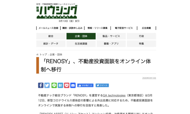 【掲載情報】新建ハウジング(2020.03.13)『「RENOSY」、不動産投資面談をオンライン体制へ移行』