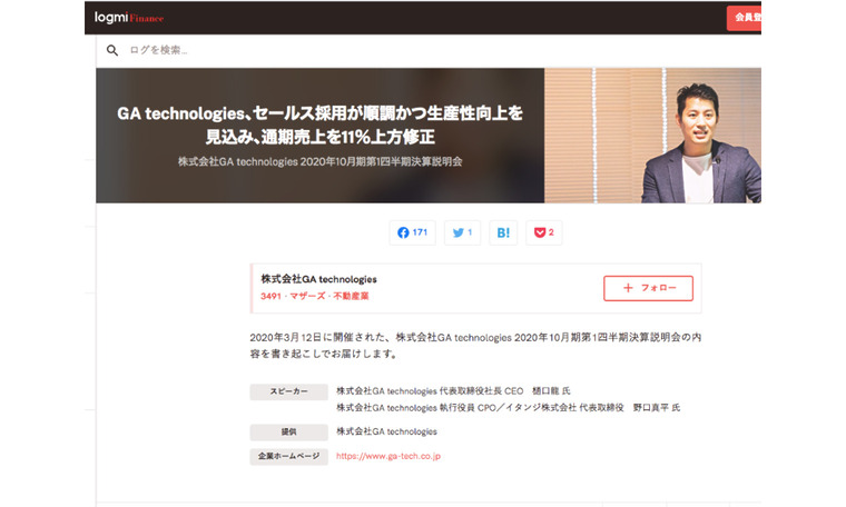 『GA technologies、セールス採用が順調かつ生産性向上を見込み、通期売上を11%上方修正』