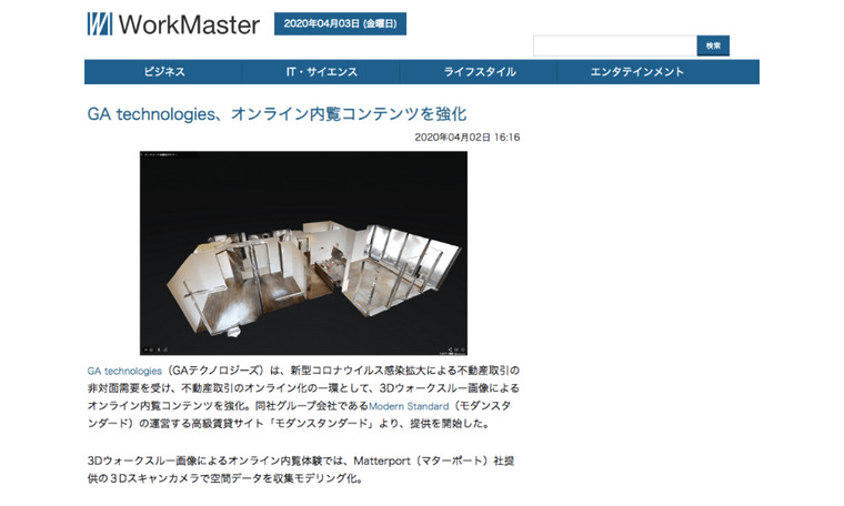 【掲載情報】WorkMaster(2020.04.02)『GA technologies、オンライン内覧コンテンツを強化』