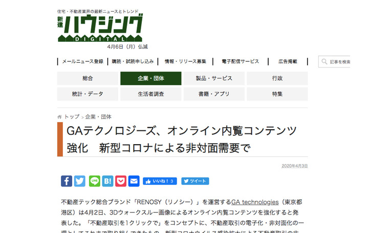 【掲載情報】新建ハウジング(2020.04.06)『GAテクノロジーズ、オンライン内覧コンテンツ強化 新型コロナによる非対面需要で』