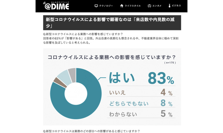 【掲載情報】@DIME(2020.04.12)『来店数や内見数は減少の一途、不動産事業者の4割超が新型コロナの影響でテレワーク導入』
