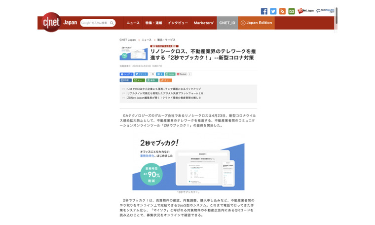CNET Japanにて、当社のグループ会社であるRENOSY Xの不動産業者間のコミュニケーションオンラインツール「2秒でブッカク!」をご紹介いただきました。