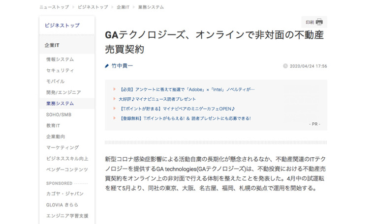 【掲載情報】マイナビニュース(2020.04.24)『GAテクノロジーズ、オンラインで非対面の不動産売買契約』