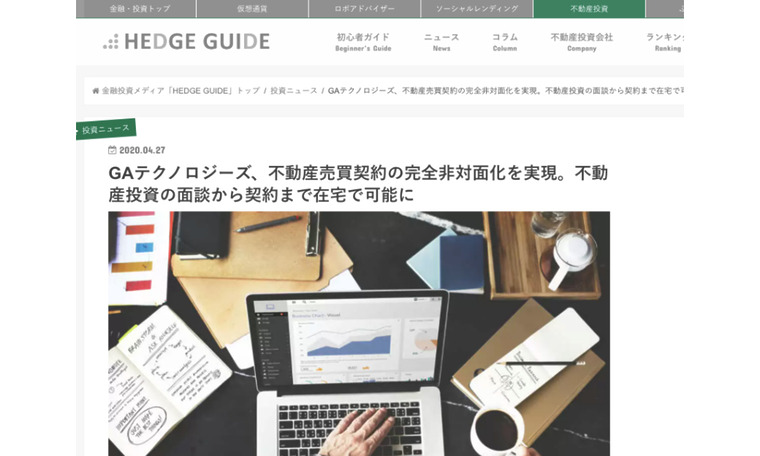 HEDGE GUIDE|『GAテクノロジーズ、不動産売買契約の完全非対面化を実現。不動産投資の面談から契約まで在宅で可能に』