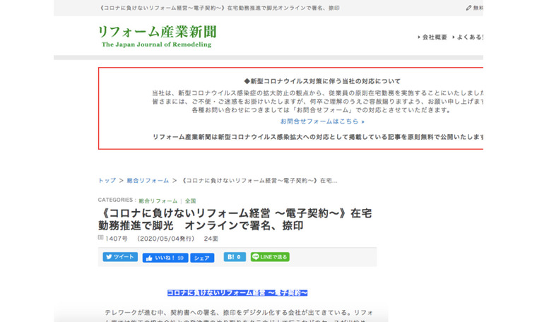【掲載情報】リフォーム産業新聞(2020.05.04)『《コロナに負けないリフォーム経営 ~電子契約~》』