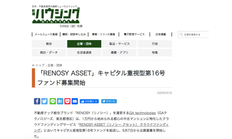 新建ハウジングにて、当社の1万円から始められる都心の中古マンションに特化したクラウドファンディングサービスをご紹介いただきました。