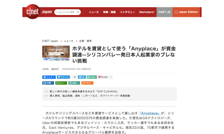 CNET Japanにて、当社のリモートワーカーやデジタルノマド向け居住シェアリングサービスを提供する米スタートアップAnyplace Inc.[エニープレイス]への出資をご紹介していただきました。なお、本件はX-Tech領域を中⼼としたスタートアップ投資事業「GA FUND(GAファンド)」の⼀環として⾏われ、GA FUNDの第3号の出資案件となります。