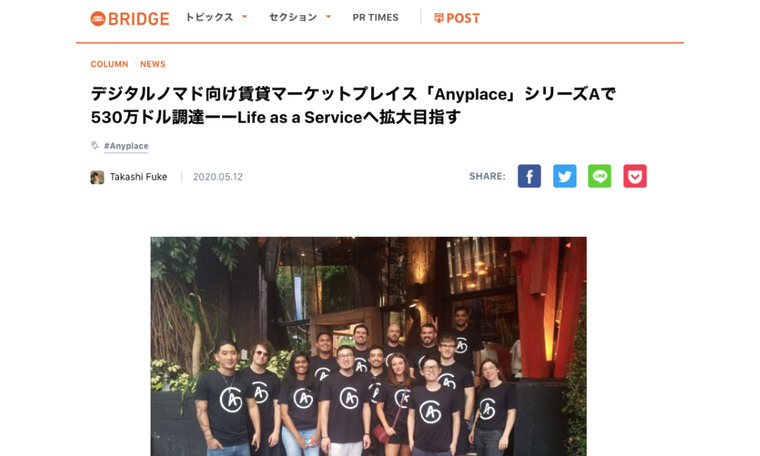 BRIDGE|『デジタルノマド向け賃貸マーケットプレイス「Anyplace」シリーズAで530万ドル調達ーーLife as a Serviceへ拡大目指す』