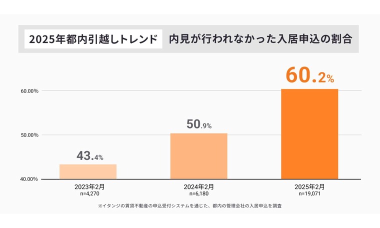 株式会社GA technologies[GAテクノロジーズ](本社:東京都港区、代表取締役 社⻑執行役員 CEO:樋⼝ ⿓、 証券コード:3491、以下「当社」)のグループ会社である、テクノロジーで不動産取引をなめらかにするイタンジ株式会社(東京都港区、以下「イタンジ」)は、東京都内に本社を置く不動産管理会社からの入居申込時の内見有無に関する調査(以下「本調査」)を行いました。本調査では、賃貸物件への引越し繁忙期である2月、都内を中心とした賃貸物件への入居申込時に、内見を行わずに入居申込を行う割合が、2023年から2025年の2年間でおよそ1.4倍に増加しており、2025年2月には60%を超える方が「内見せずに入居申込」をしていることがわかりました(※)。